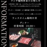 2026-01-22 / 最終更新日 : 2026-01-22 しゃぶしゃぶ すき焼き 千宮 立川店 プレスリリース ランチ臨時休業のお知らせ 明日1月23日(金)は、システムメンテナンスの為、ランチタイムをお休みさせていただきます。 ランチ臨時休業のお知らせ 明日1月23日(金)は、システムメンテナンスの為、ランチタイムをお休みさせていただきます。 ディナー(19:00)より通常通り営業いたします。 ご不便をおかけしますが、よろしくお願いいたします。 […]